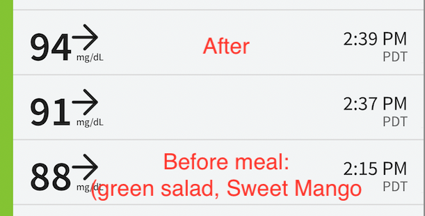 Now, I eat a green salad before putting carbs in my body and there is no spike. Eat your favorite carbs guilt free 🙂. An example of a desert (mango) with greens